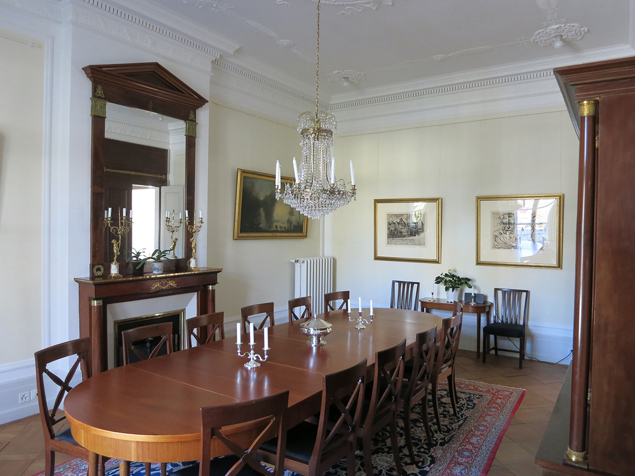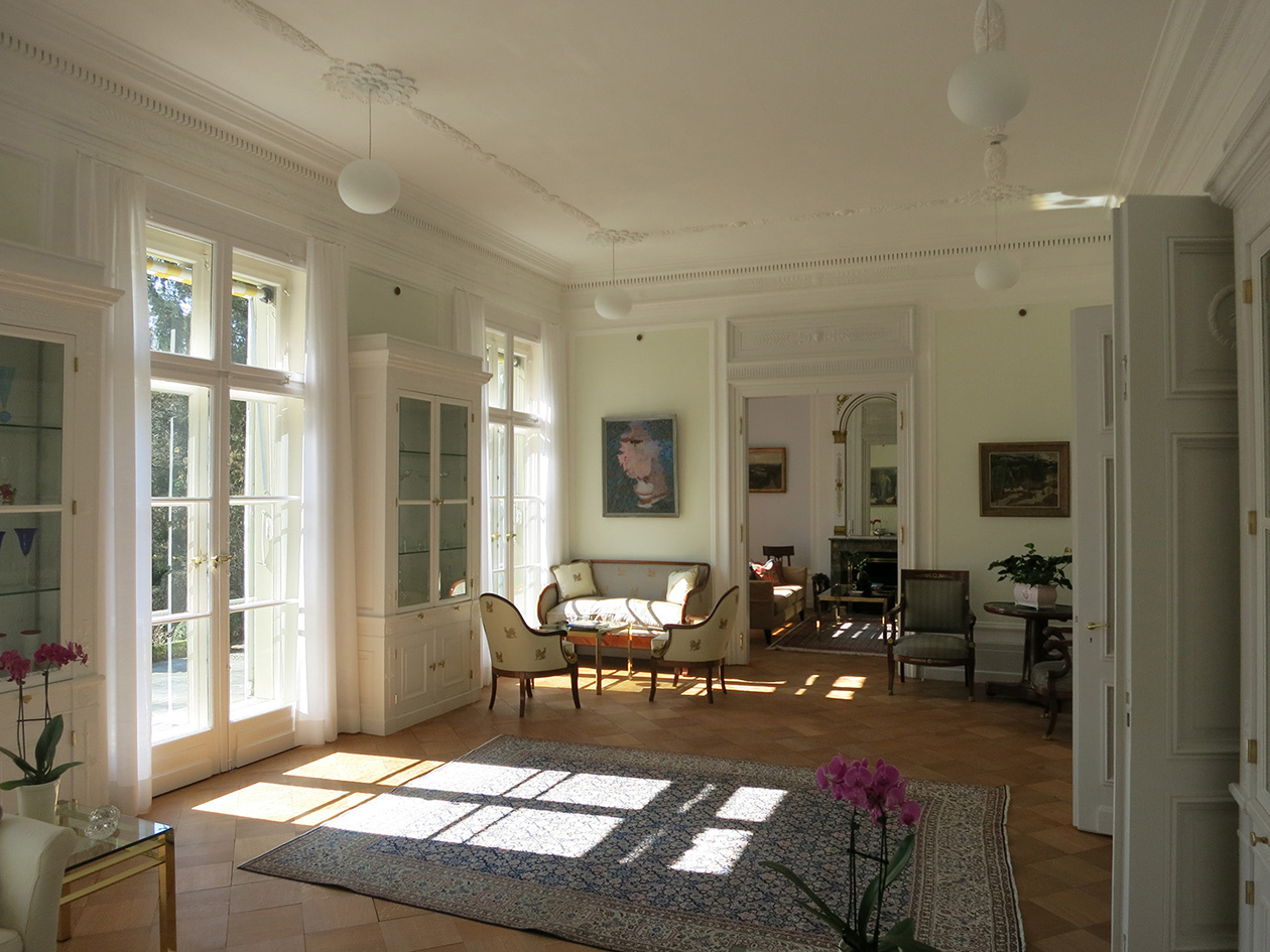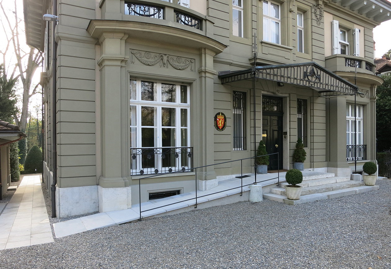 situé dans le quartier protégé du kirchenfeld, le bâtiment neo-baroque a été construit en 1902 par l'architecte von fischer. pour sa valeur intrinsèque et sa situation avec le généreux jardin, le bâtiment fait partie des monuments historiques protégés. des travaux d'entretien, d'assainissement et des adaptations à la mission de résidence d'ambassadeur sont entrepris en concertation avec le service des monuments et sites de la ville de berne.